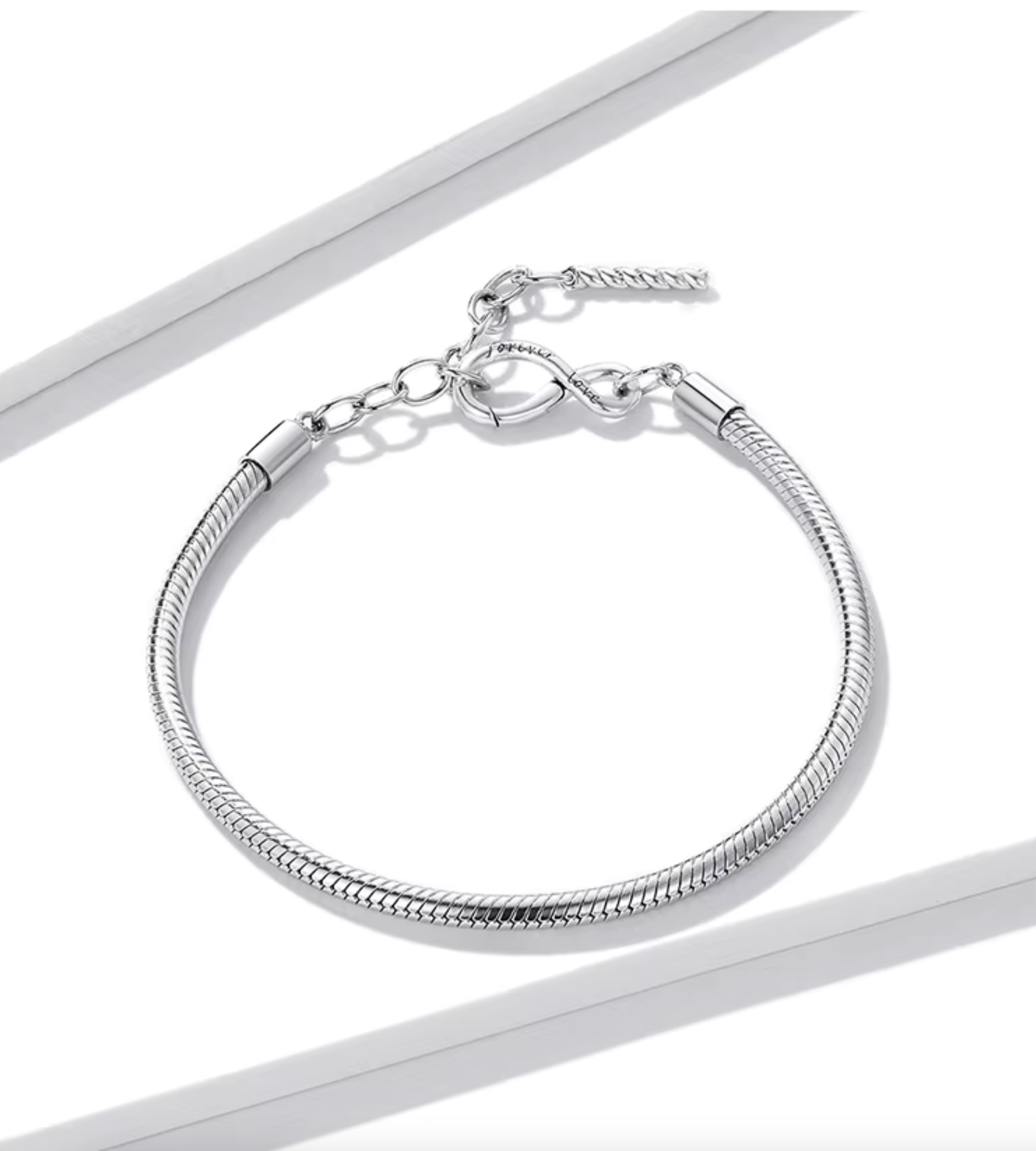 This elegant snake bone bracelet features a minimalist design with a subtle infinity symbol, adding a touch of timeless sophistication. Its sleek, flexible structure makes it a versatile accessory, perfect for everyday wear or layering with other jewelry.