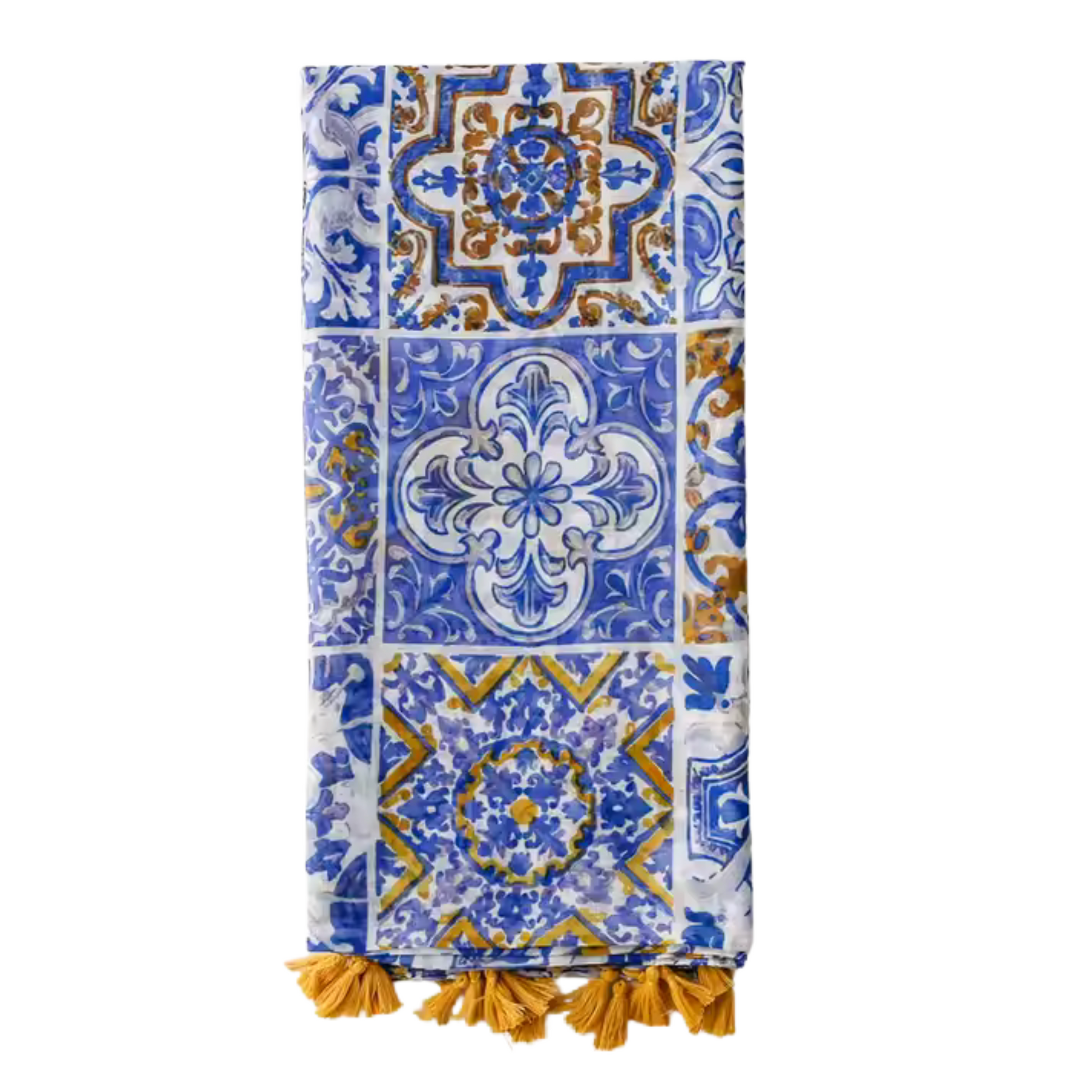 Inspired by the intricate beauty of Mediterranean tiles, this stunning scarf features a captivating mix of blue, white, and golden hues. Lightweight and airy, this elegant piece is finished with delicate mustard-yellow tassels for a charming and sophisticated touch.