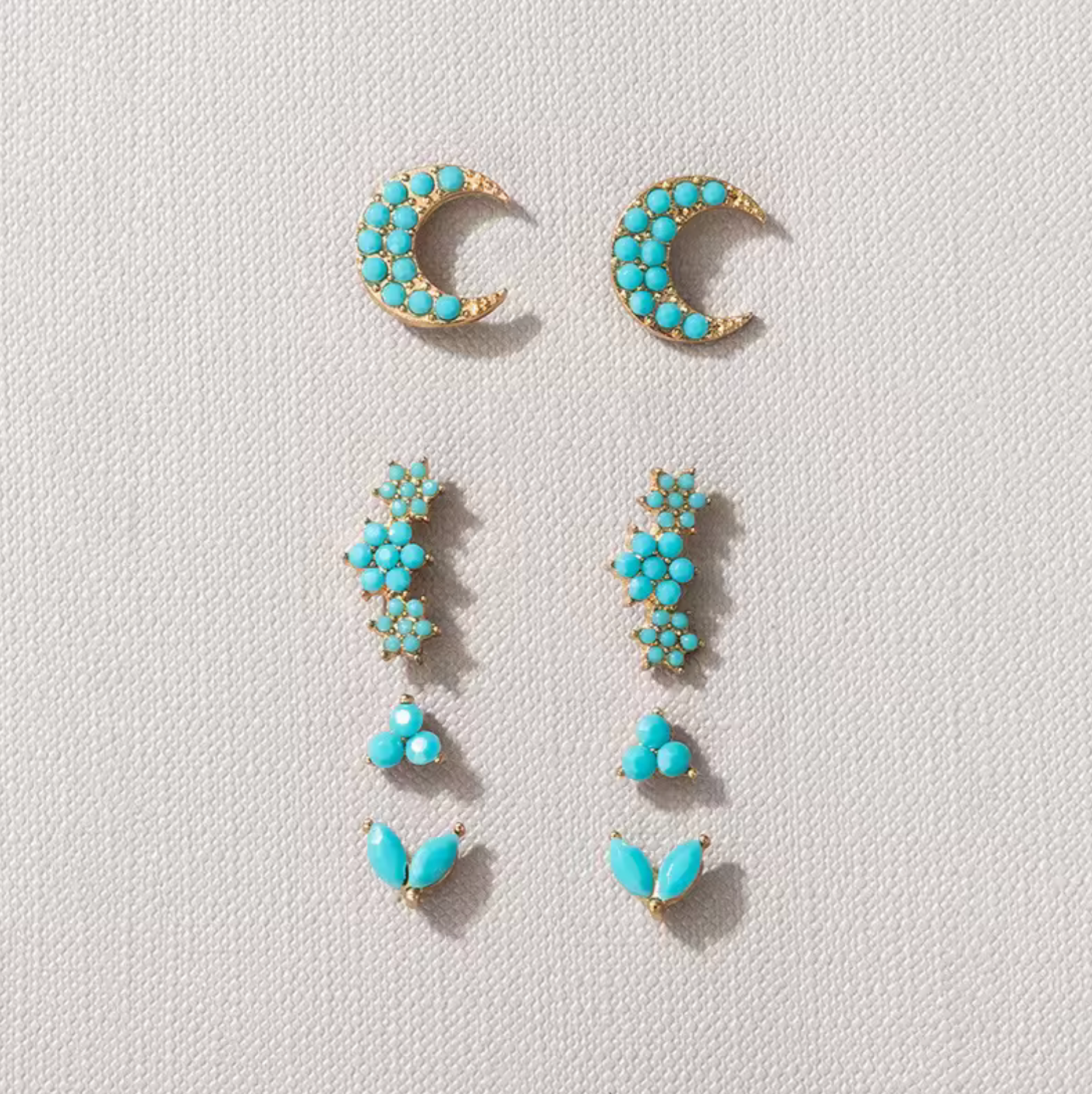 Embrace versatile style with this stunning turquoise boho stud earring set. Featuring a mix of crescent moons, florals, and geometric shapes, this collection adds charm and variety to your jewelry collection.