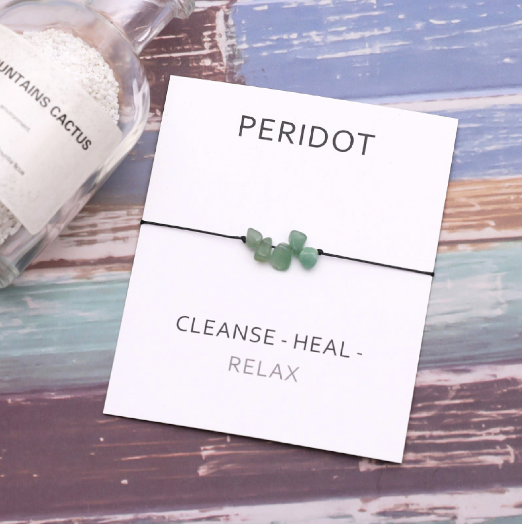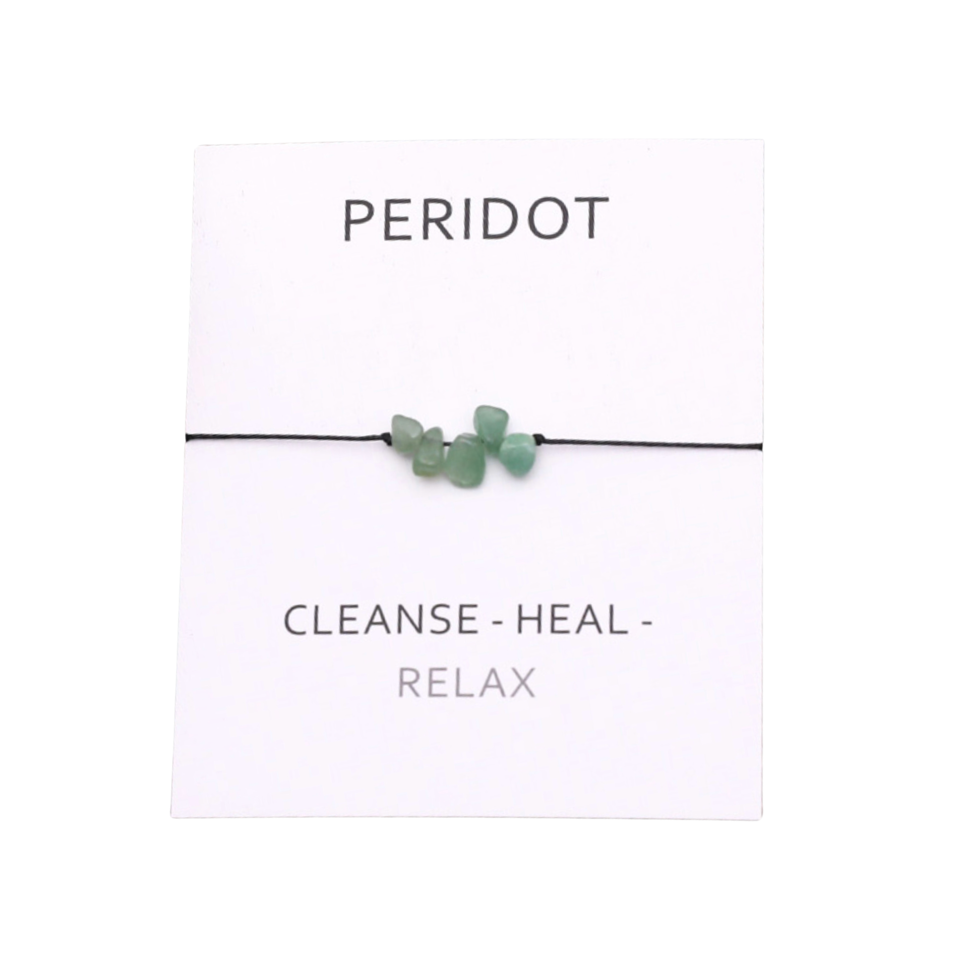 Embrace tranquility and renewal with the Peridot Bracelet. Featuring natural peridot stones on an adjustable black cord, this bracelet promotes cleansing, healing, and relaxation.