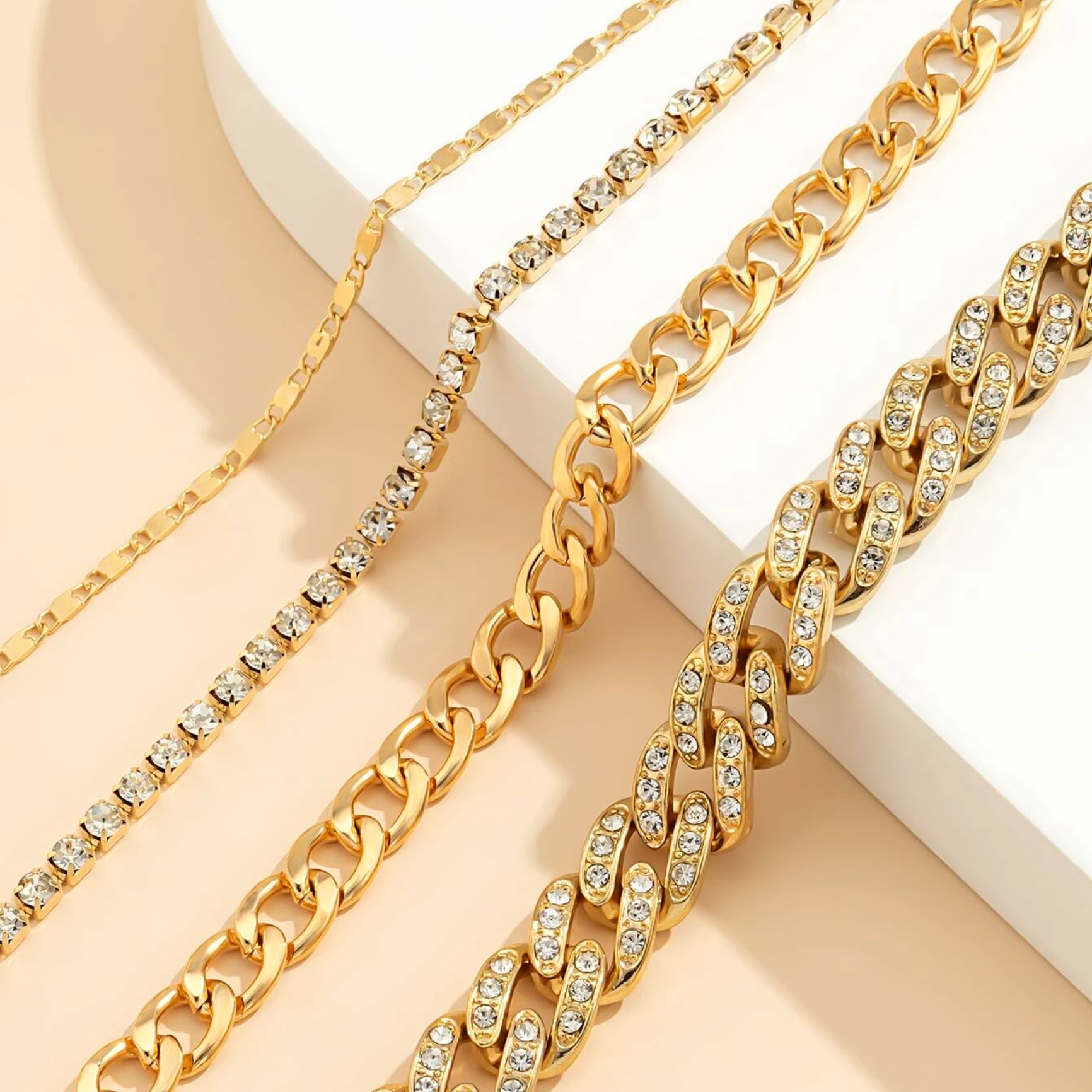 • Variety of Designs: Includes chunky chains, crystal-encrusted links, and delicate chain details.