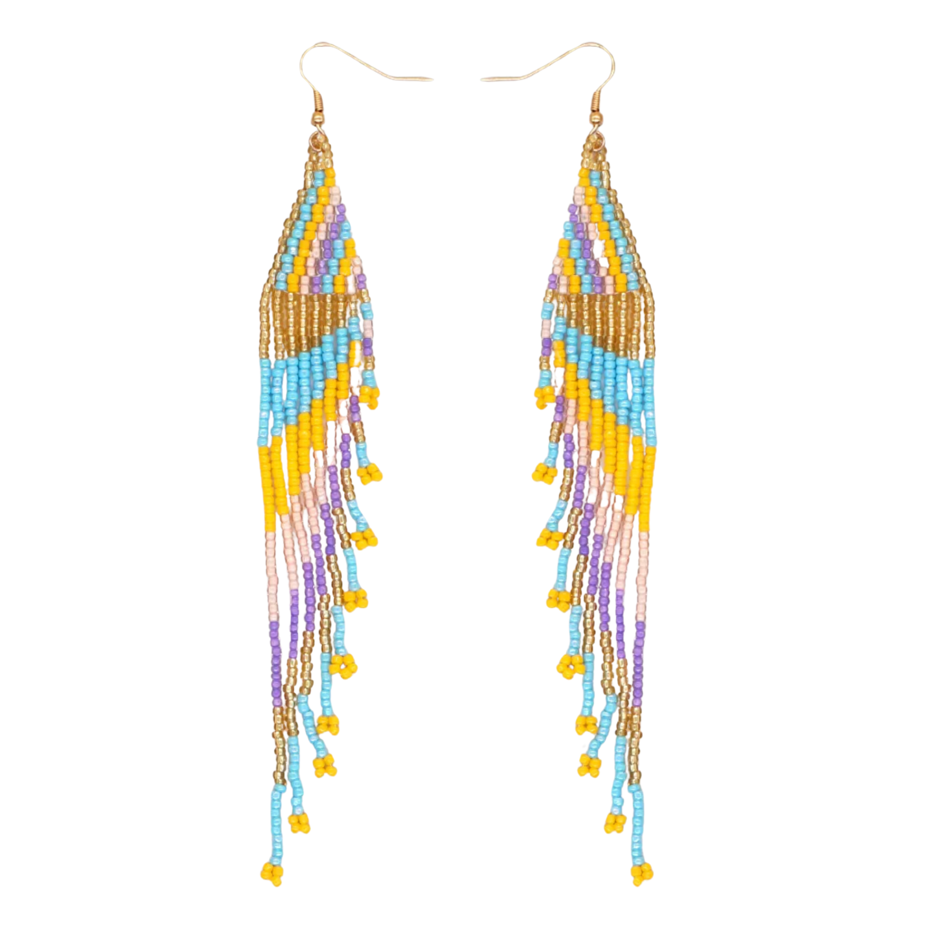 Celebrate vibrant style with these handcrafted pastel seed bead earrings. Featuring cascading fringe in soft hues of blue, yellow, pink, and purple, accented with shimmering gold beads, these earrings are perfect for adding a playful touch to your look.