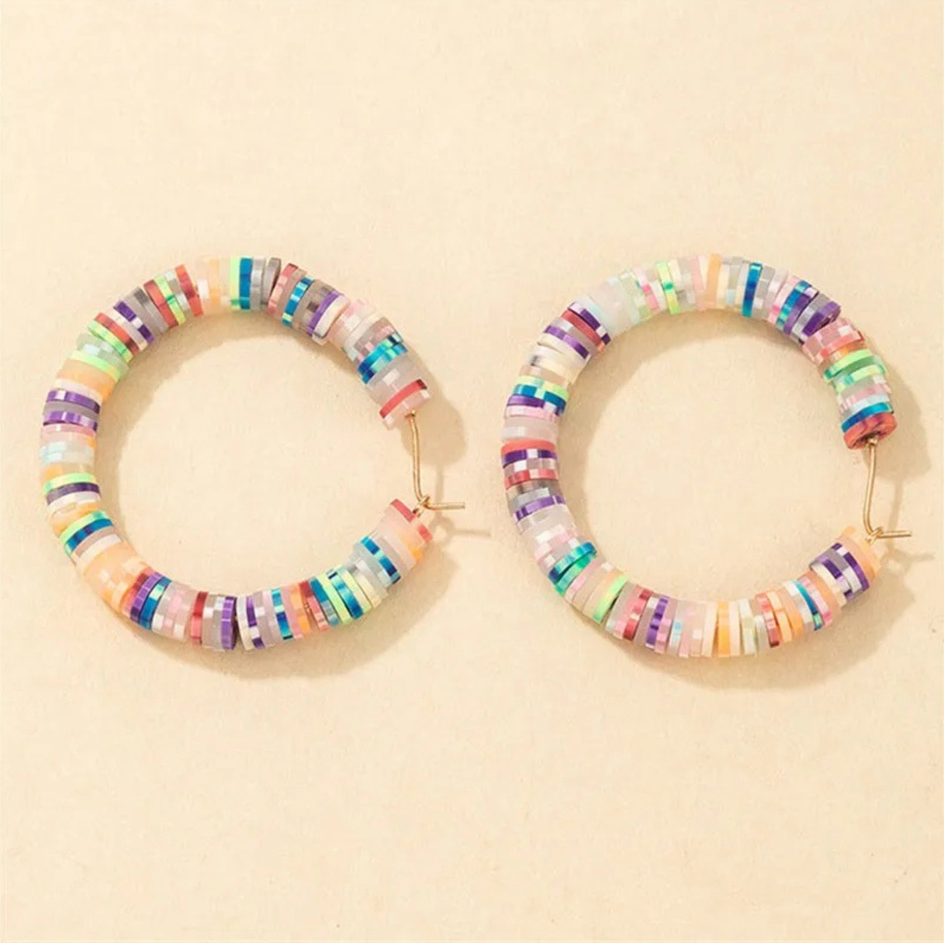 Add a playful pop of color to your look with these vibrant multicolor beaded hoop earrings. Featuring a mix of stacked disc beads in a variety of bright and iridescent tones, these lightweight hoops bring a fun and modern touch to any outfit.