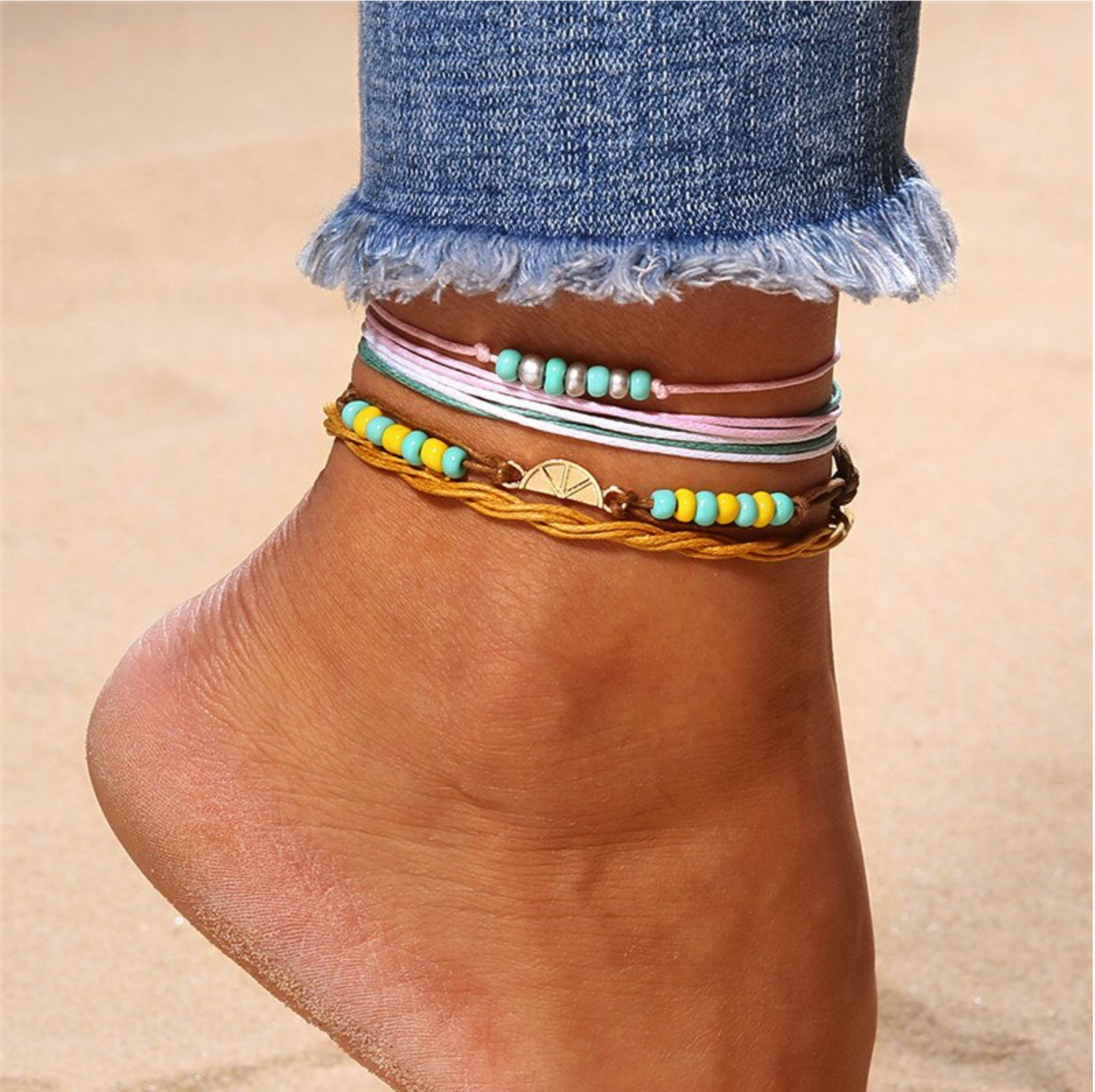- Set of Four Anklets: Includes a combination of braided, beaded, and string designs for versatile styling.