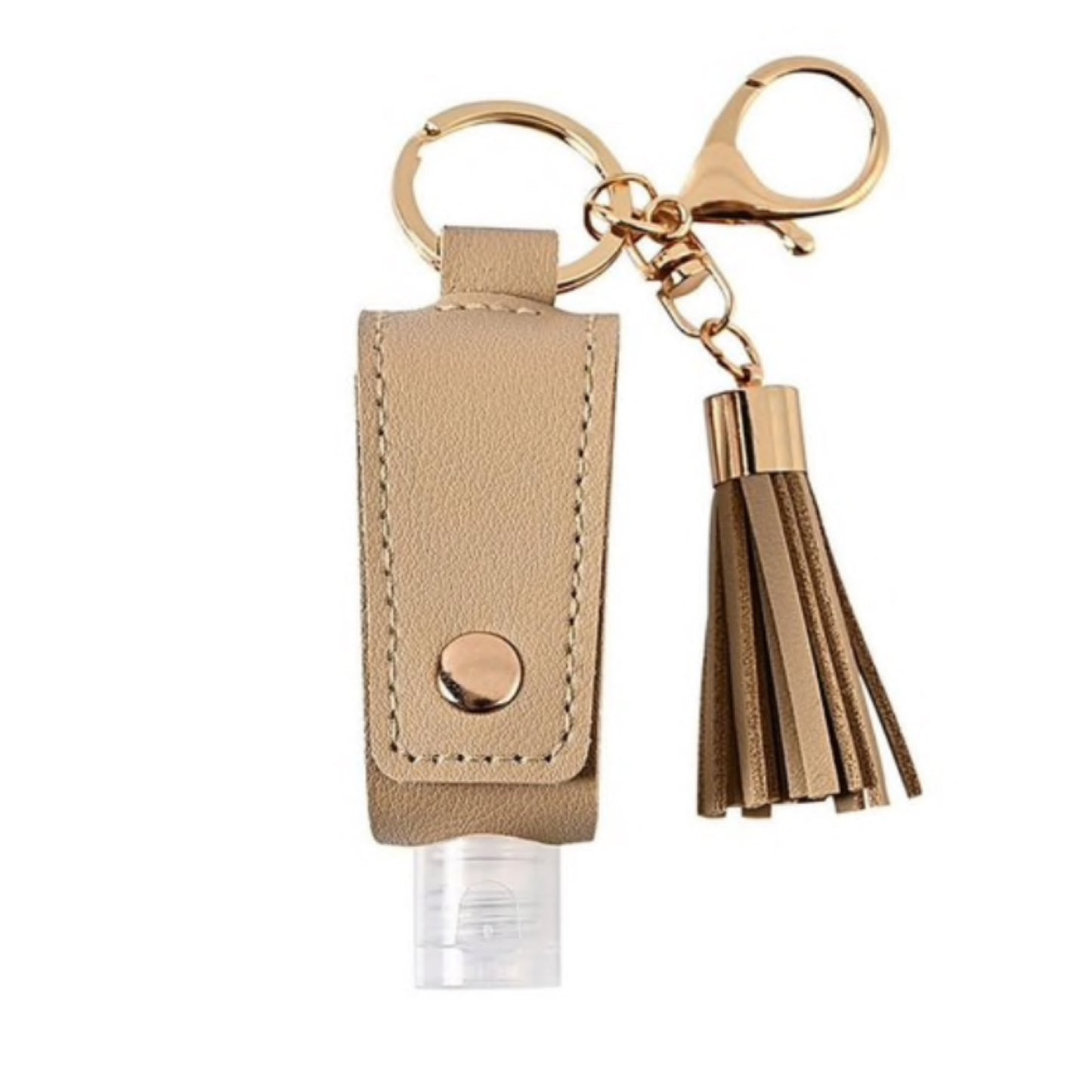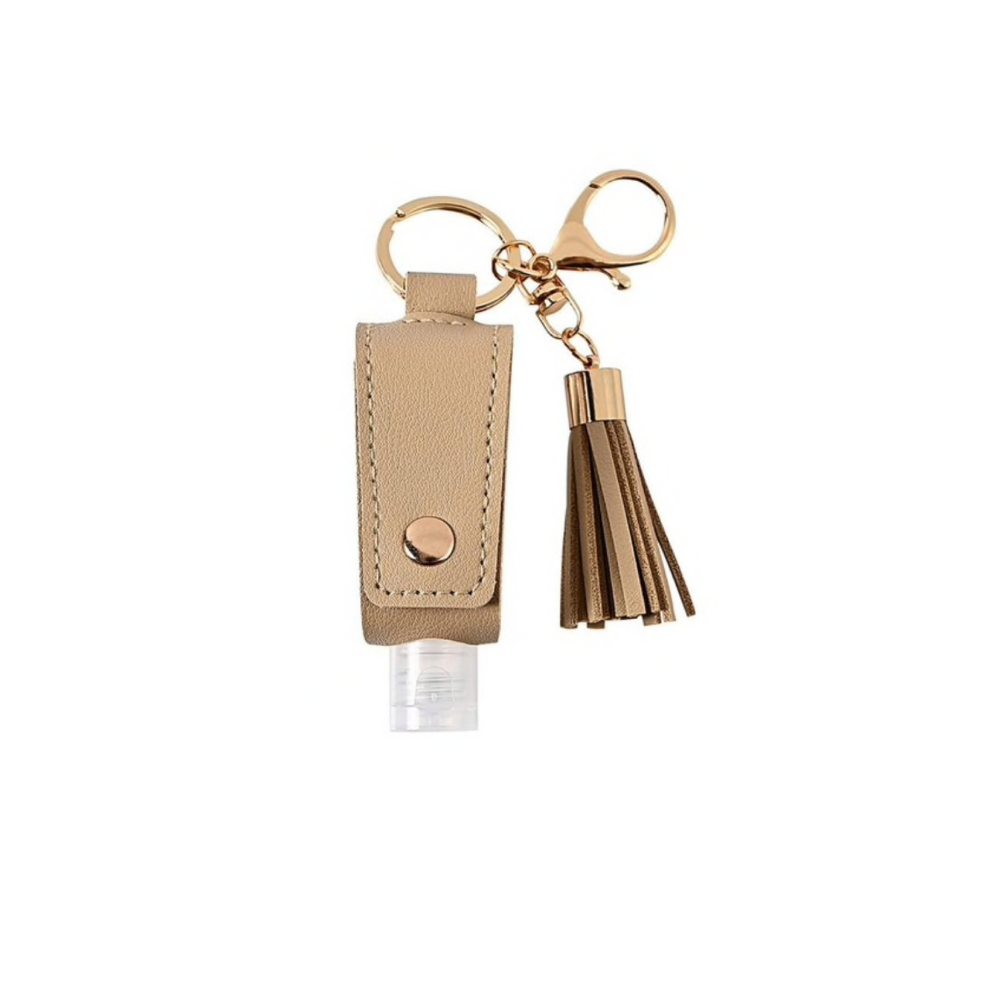 Upgrade your hygiene routine with the Beige Goldtone Tassel Hand Sanitizer Keychain with Empty Bottle. It allows you to: