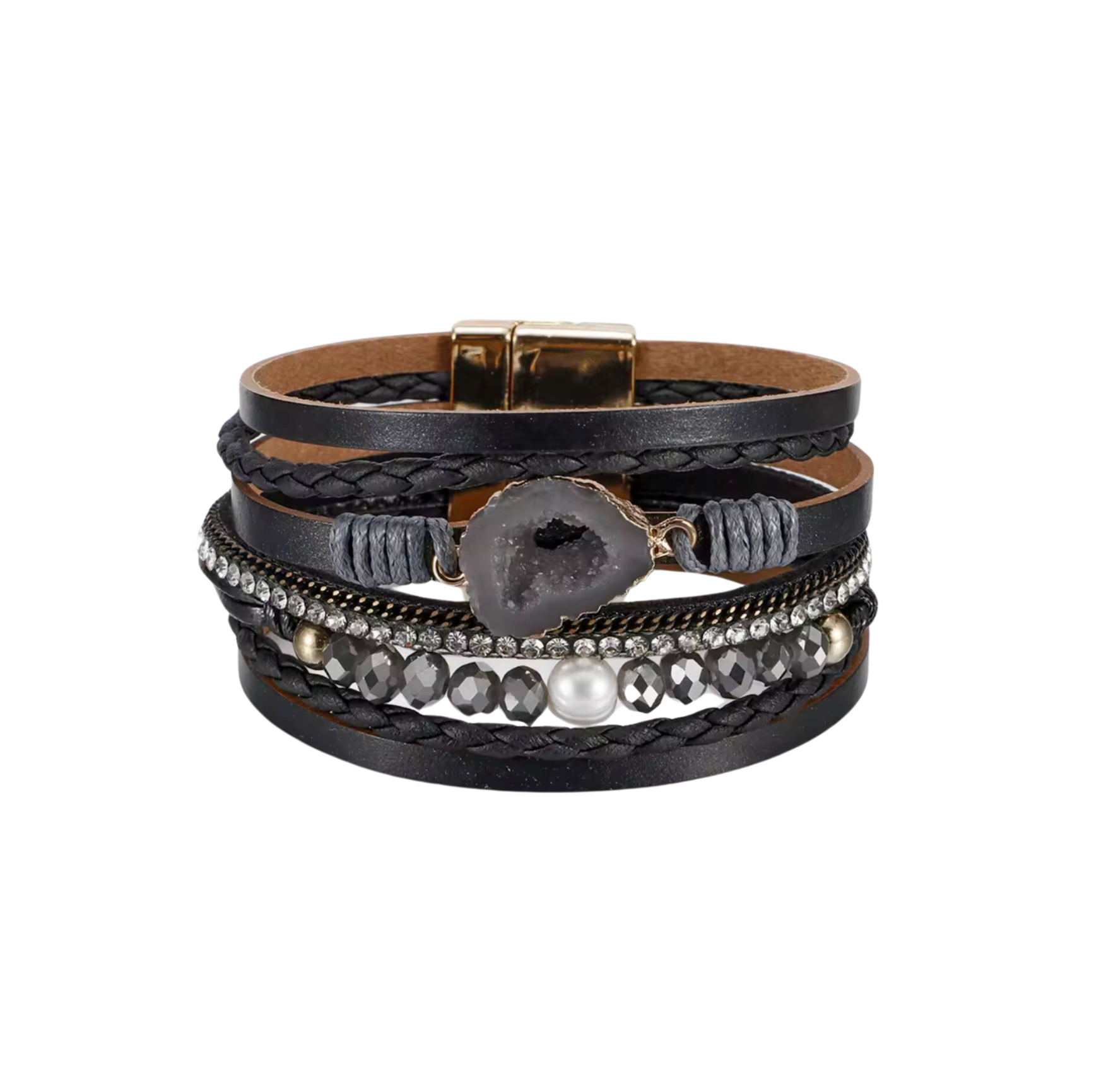 • Multi-Layered Design: A stylish mix of braided leather, faceted beads, and rhinestone accents for a bold yet sophisticated aesthetic.