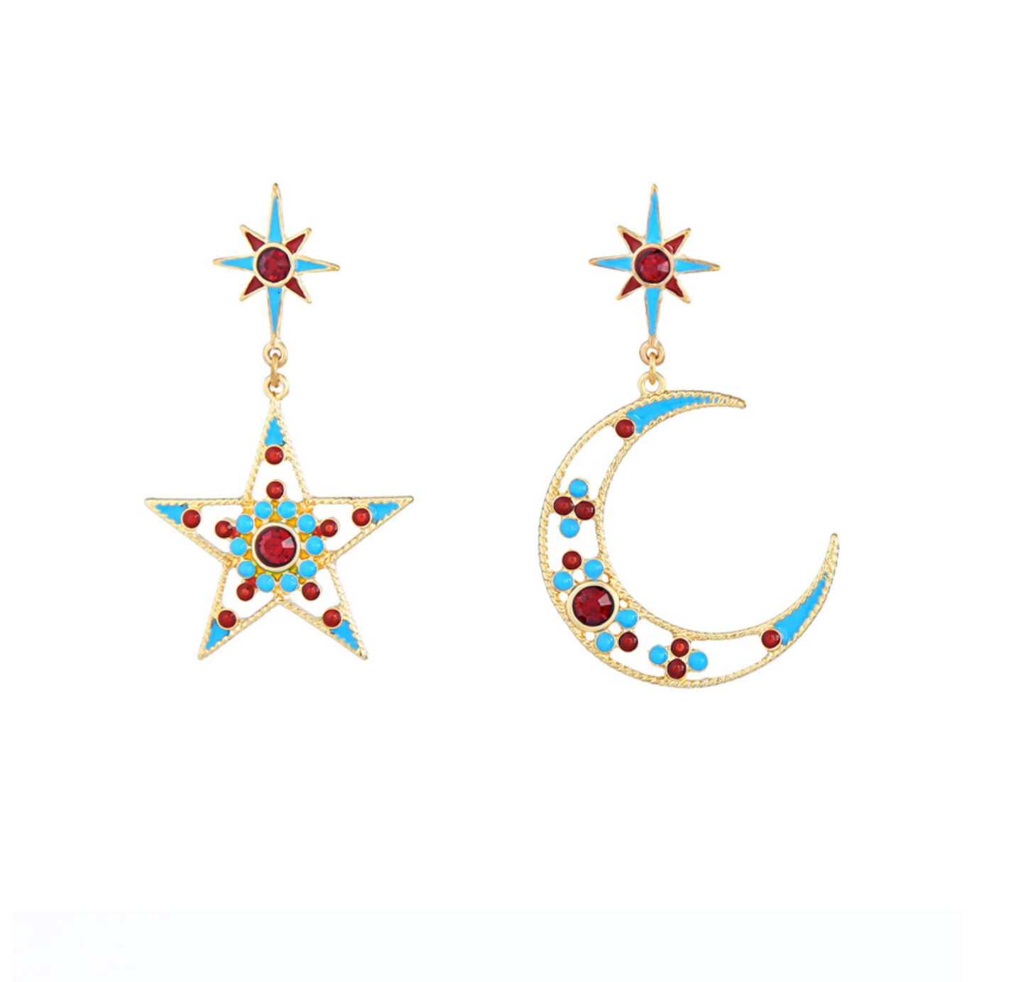 Overview of the Blue Red Crystal Moon And Star Drop Earrings