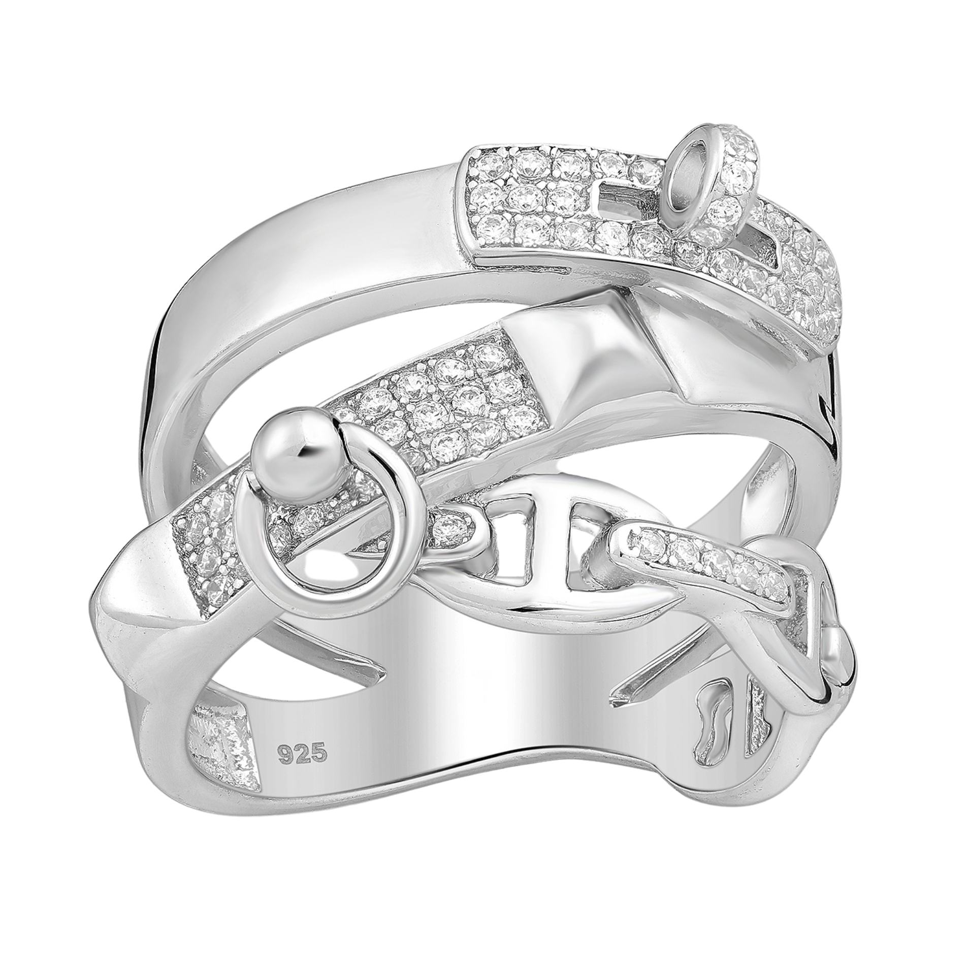 This sterling silver multi-band ring is the perfect combination of modern design and timeless elegance. With its brilliant CZ simulated diamonds and layered details, it is sure to become a favorite piece in your jewelry collection.
