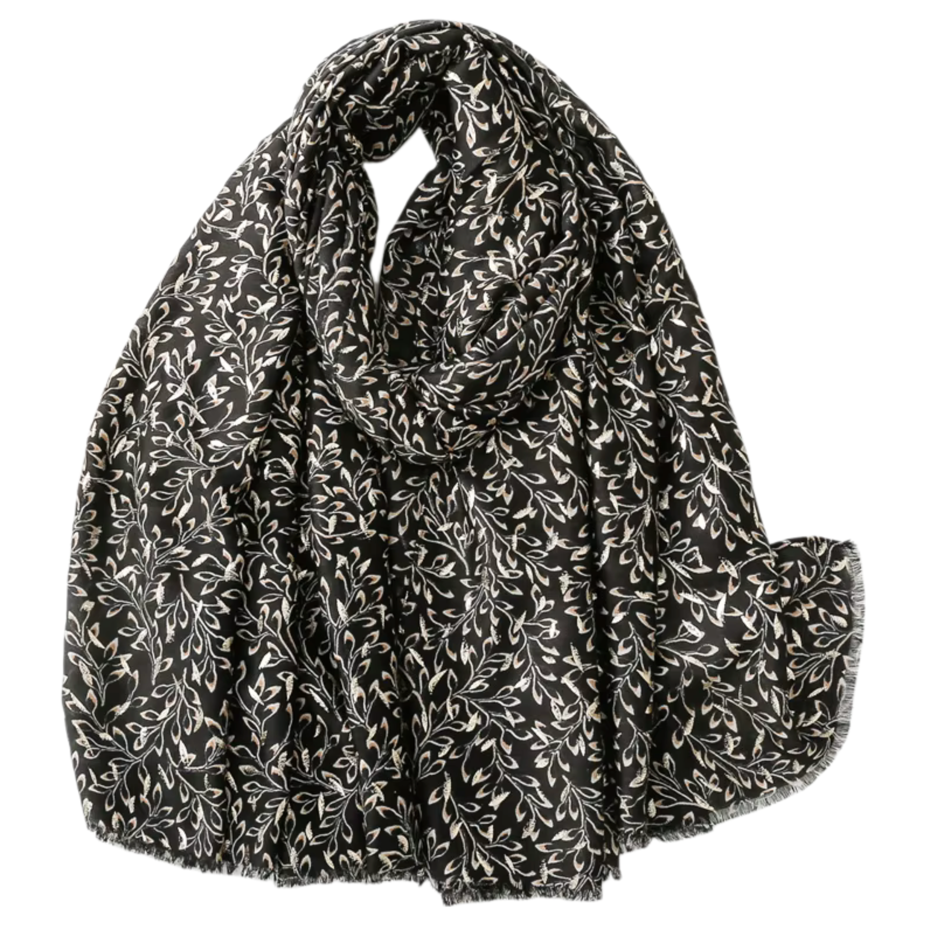 This sophisticated scarf features a delicate leaf pattern in cream against a classic black background, offering a timeless and versatile design. Lightweight and finished with soft edges, it is perfect for elevating any outfit with subtle elegance.