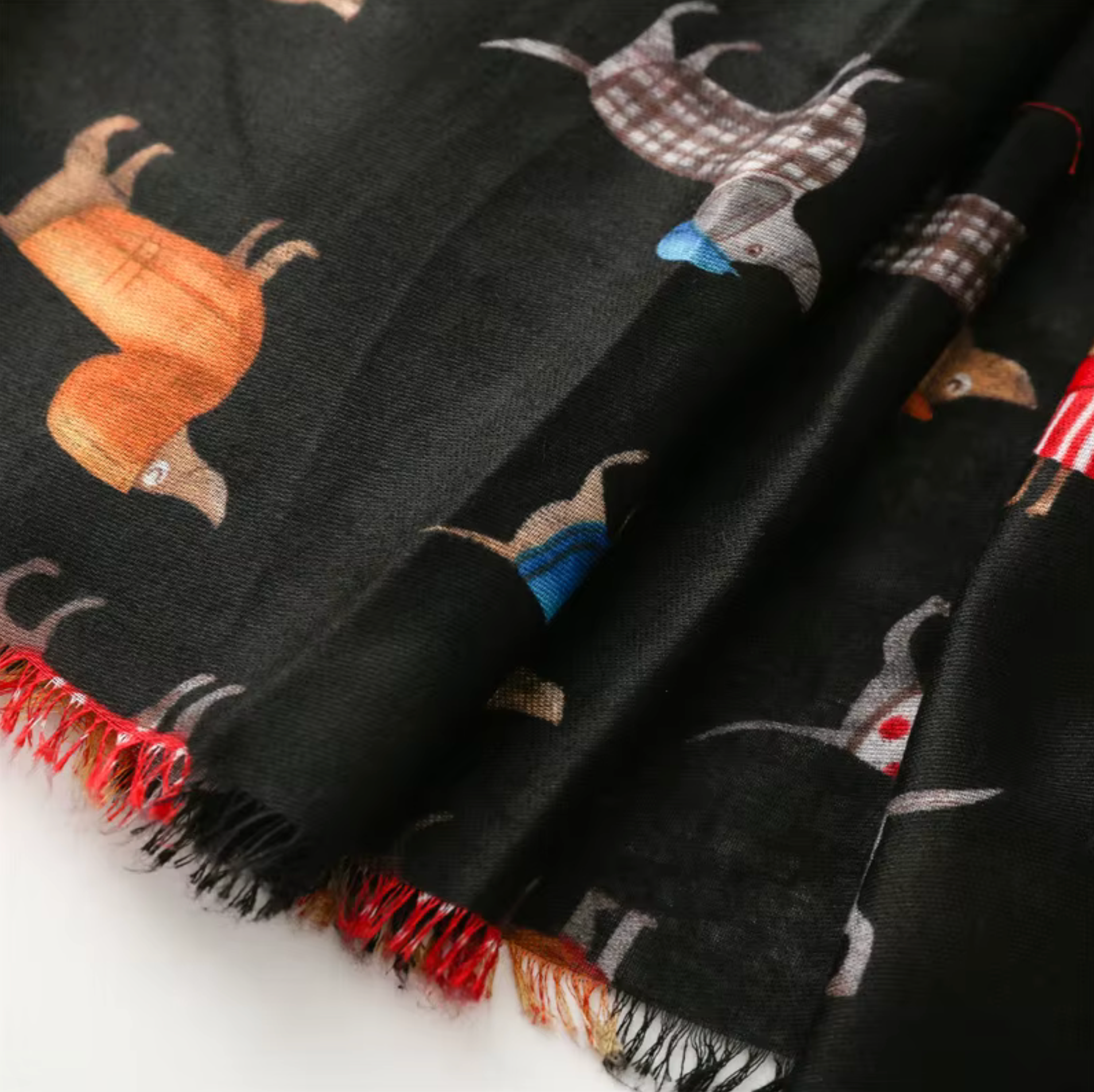 This playful scarf features an adorable dachshund print, each dog dressed in colorful patterns, set against a black background. Its lightweight fabric and charming fringe edges make it a delightful accessory for dog lovers and fashion enthusiasts alike.